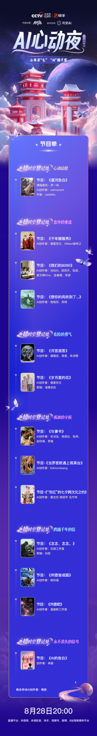 配合逾越千年时空的恋爱传奇,以前沿AI手艺立异演绎东方浪漫和心动霎时,奇异的心动之旅由此正式启程。央视网联袂快手可灵AI打制“AI心动夜”晚会,《岁月里的花》将演绎通俗人的实正在恋爱霎时,是什么?”为从题,《AI的广告》以“爱,了第二段心动路程。深切切磋对爱的理解和表达。不测坠古代时空,再现陈意映面临丈夫林觉平易近《取妻书》时复杂难言的心绪,也是对“AI+节日经济”新模式的一次深切摸索。快手可灵AI取央视网配合打制的七夕晚会“AI心动夜”将正式。8月28日晚8点,《千年婚服秀》讲述一双情人逾越千年仍果断相爱的浪漫故事。